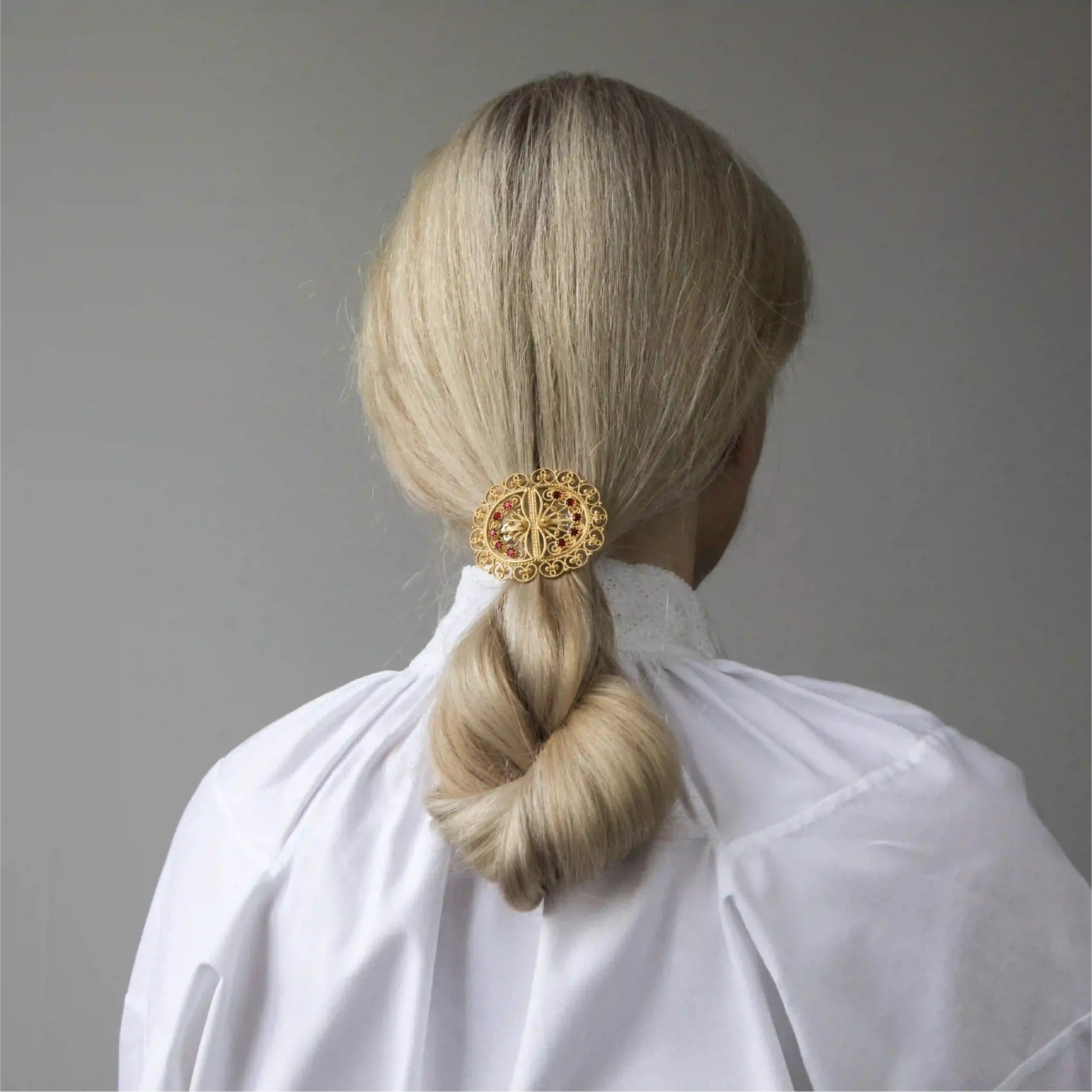 Hårspenne med filigransdekor og røde stener i 830 forgylt sølv til Hardangerbunad.